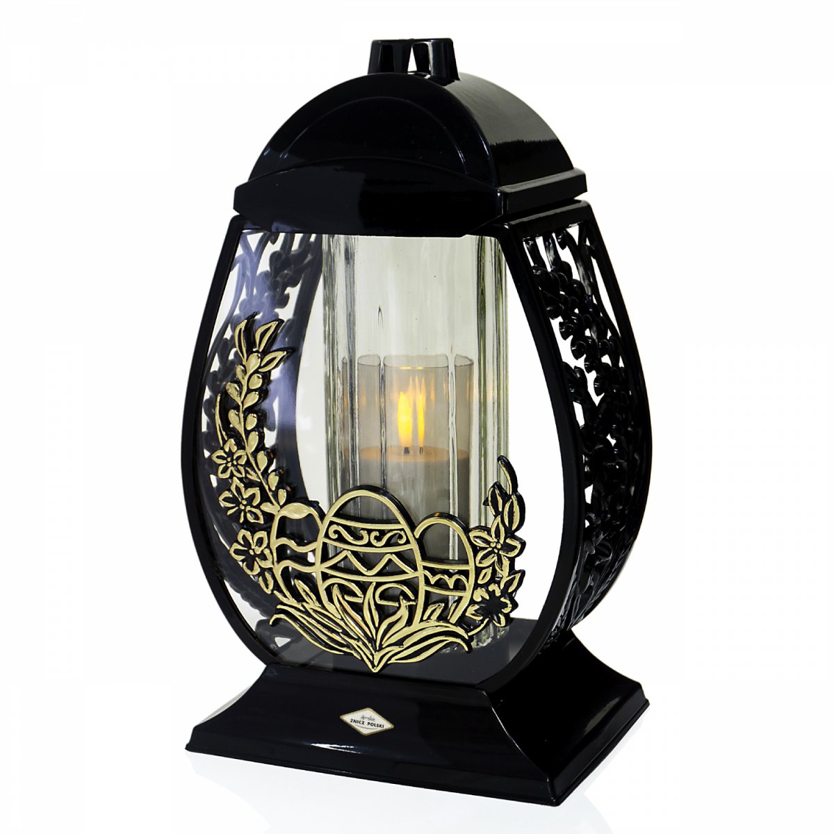 Elegancki i wyjątkowy znicz w klasycznej czerni ze złotą, wielkanocną aplikacją przedstawiającą dekoracyjne jajka oraz roślinne ornamenty. Subtelne zdobienia w połączeniu z przezroczystym szkłem nadają mu uroczysty i ponadczasowy charakter.