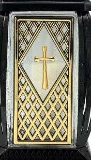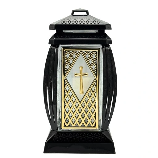 Prezentowany znicz to elegancki model wykonany z trwałego tworzywa sztucznego, który doskonale sprawdzi się jako dekoracja nagrobna. Posiada klasyczny kształt i piękne zdobienia – złoty krzyż na tle geometrycznego wzoru w kolorze złota nadaje mu wyjątkowego charakteru.