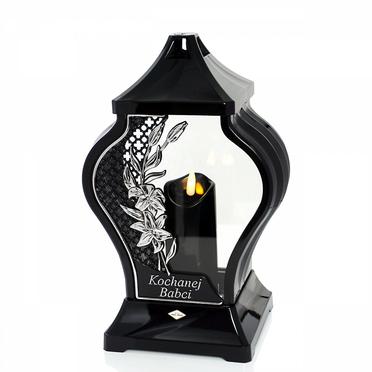 Czarna, błyszcząca obudowa połączona ze srebrnymi kwiatami i napisem „Kochanej Babci” tworzy elegancki i ponadczasowy efekt.
