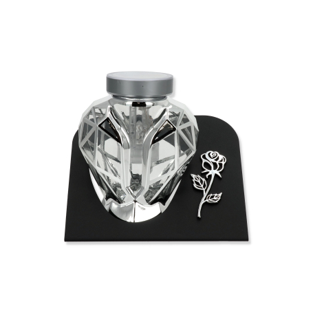 Elegancki znicz solarny o nowoczesnej formie, który zachwyca swoim wyjątkowym designem. Szklany korpus o geometrycznych kształtach został ozdobiony srebrnymi elementami, nadając całości luksusowego charakteru. Umieszczony na czarnej podstawie z dekoracyjną różą w kolorze srebra tworzy stylową i trwałą ozdobę miejsca pamięci.