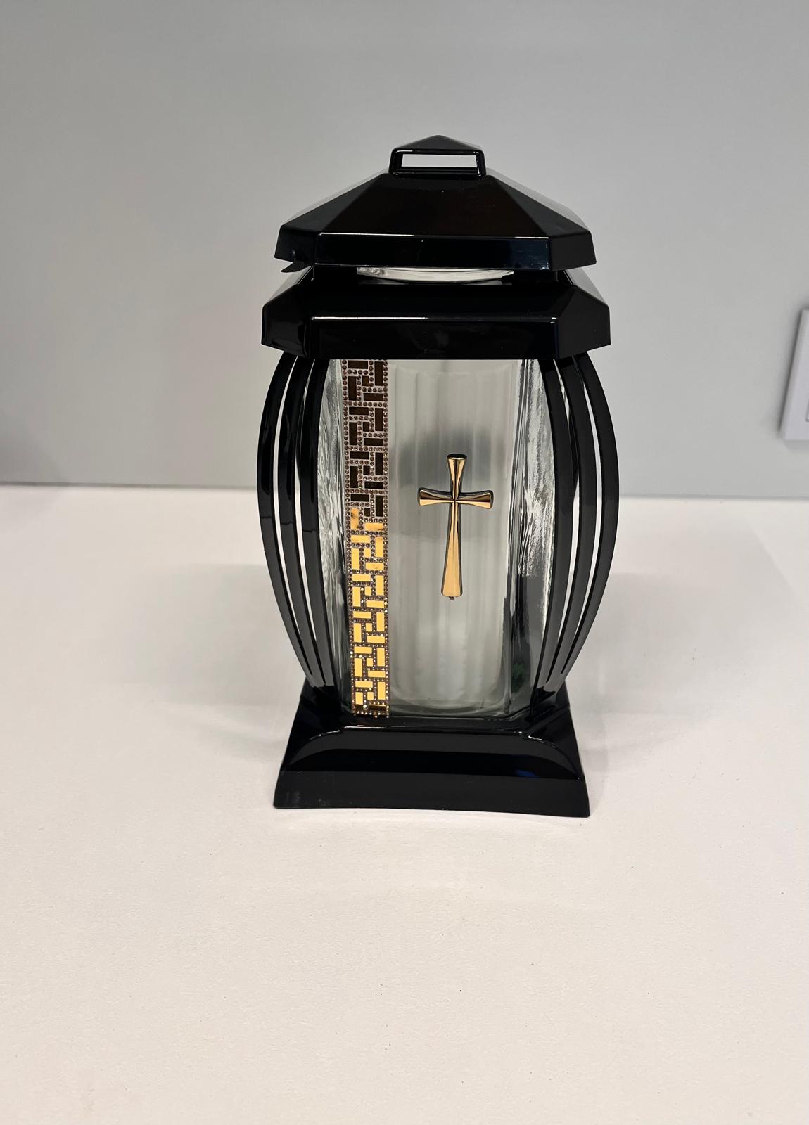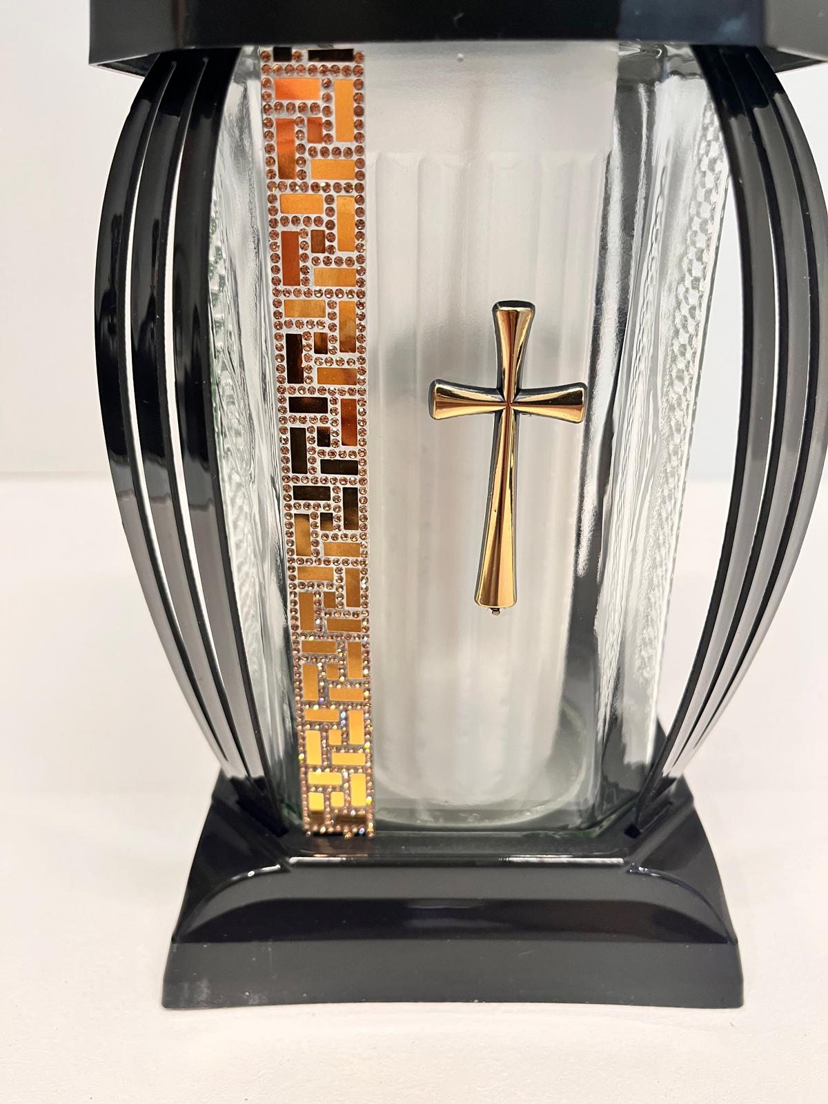Znicz kapliczka to wyjątkowe połączenie klasycznej formy z eleganckimi detalami. Starannie wykonana konstrukcja w kolorze głębokiej czerni została wzbogacona subtelnymi złotymi akcentami, w tym ozdobnym krzyżem oraz dekoracyjnym wzorem, które nadają całości dostojnego charakteru.