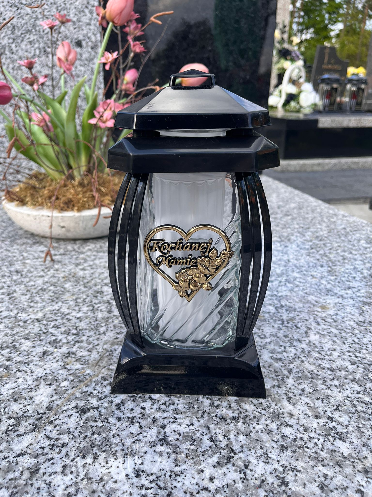 Podstawka oraz kapturek wykonany z plastiku w kolorze czarnym + aplikacja z NAPISEM – KOCHANEJ MAMIE