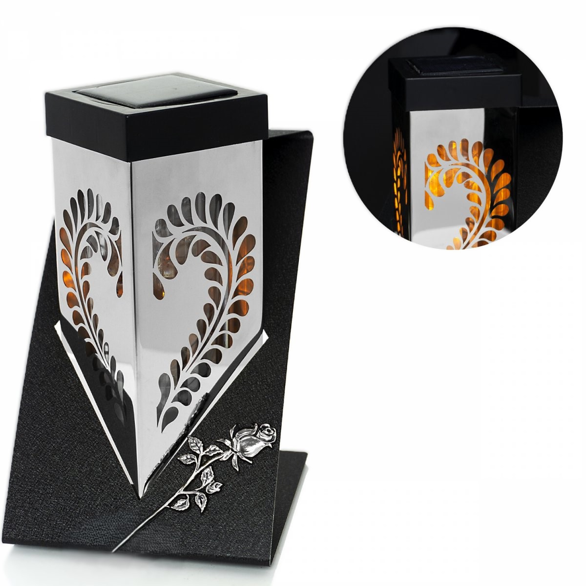 Elegancki i nowoczesny znicz solarny o wyjątkowym, ażurowym wzorze z motywem róży. Subtelne wycięcia w kształcie liści tworzą piękną grę światła, a ciepły, migoczący płomień LED nadaje całości nastrojowy i pełen zadumy charakter.
