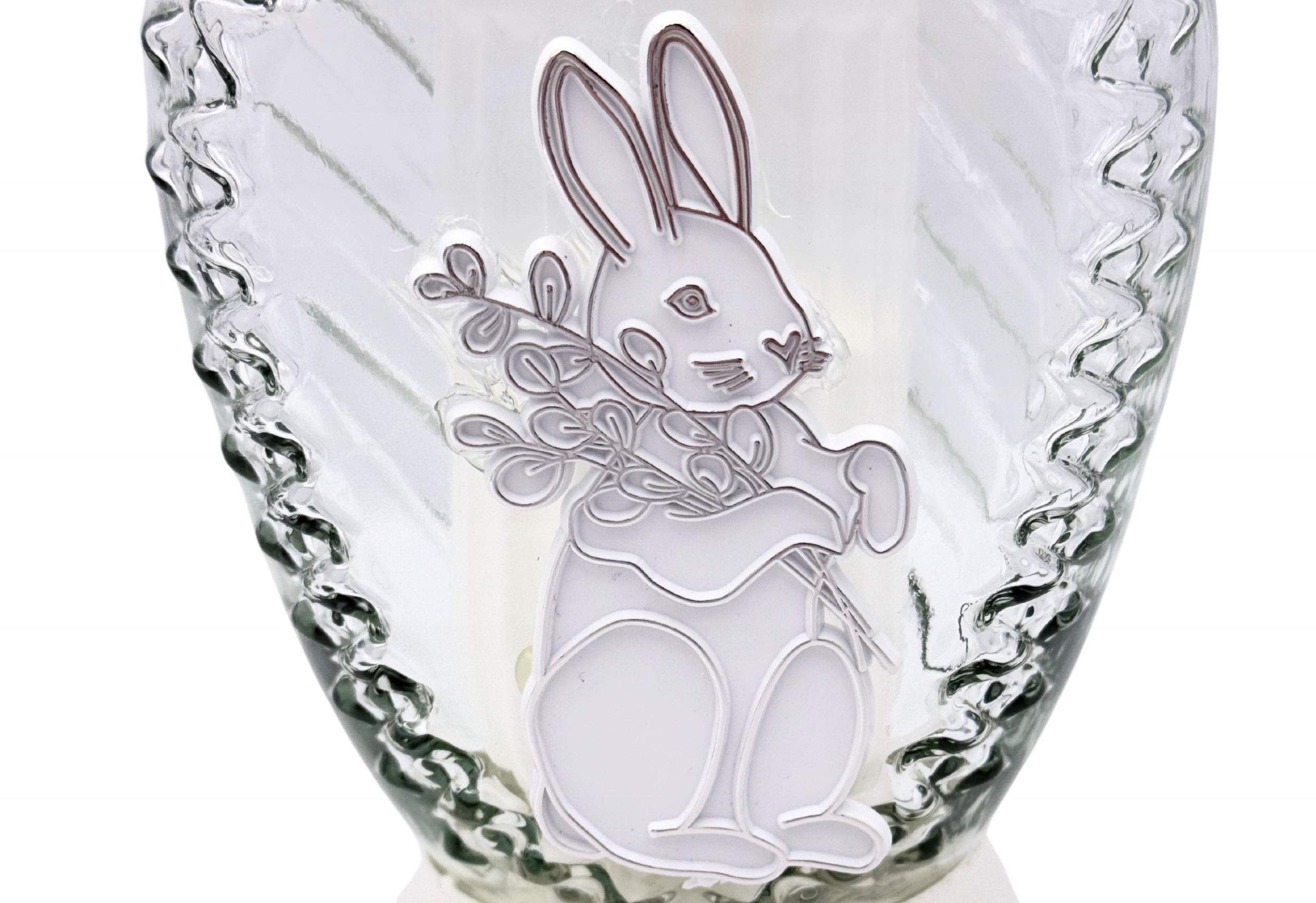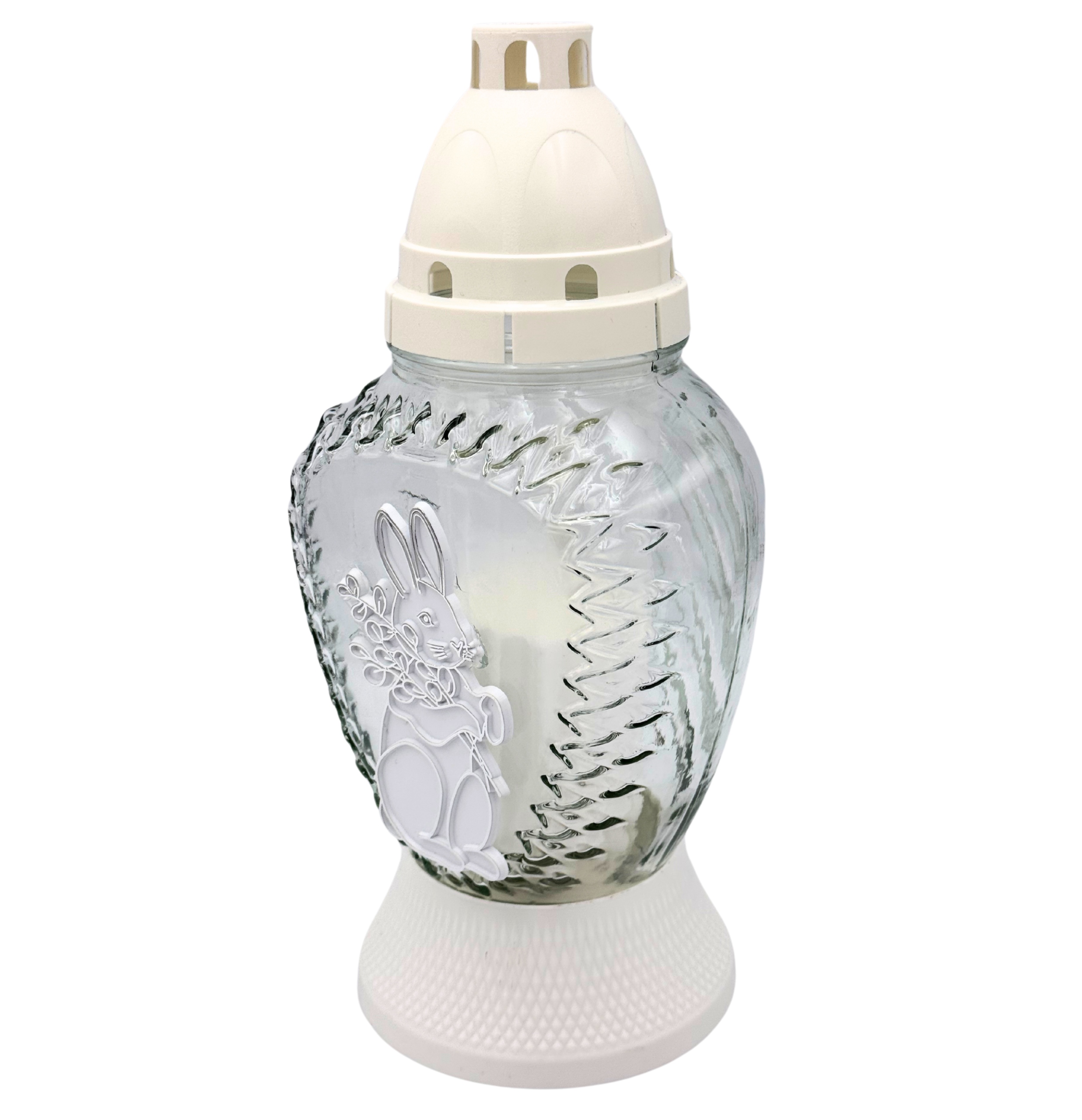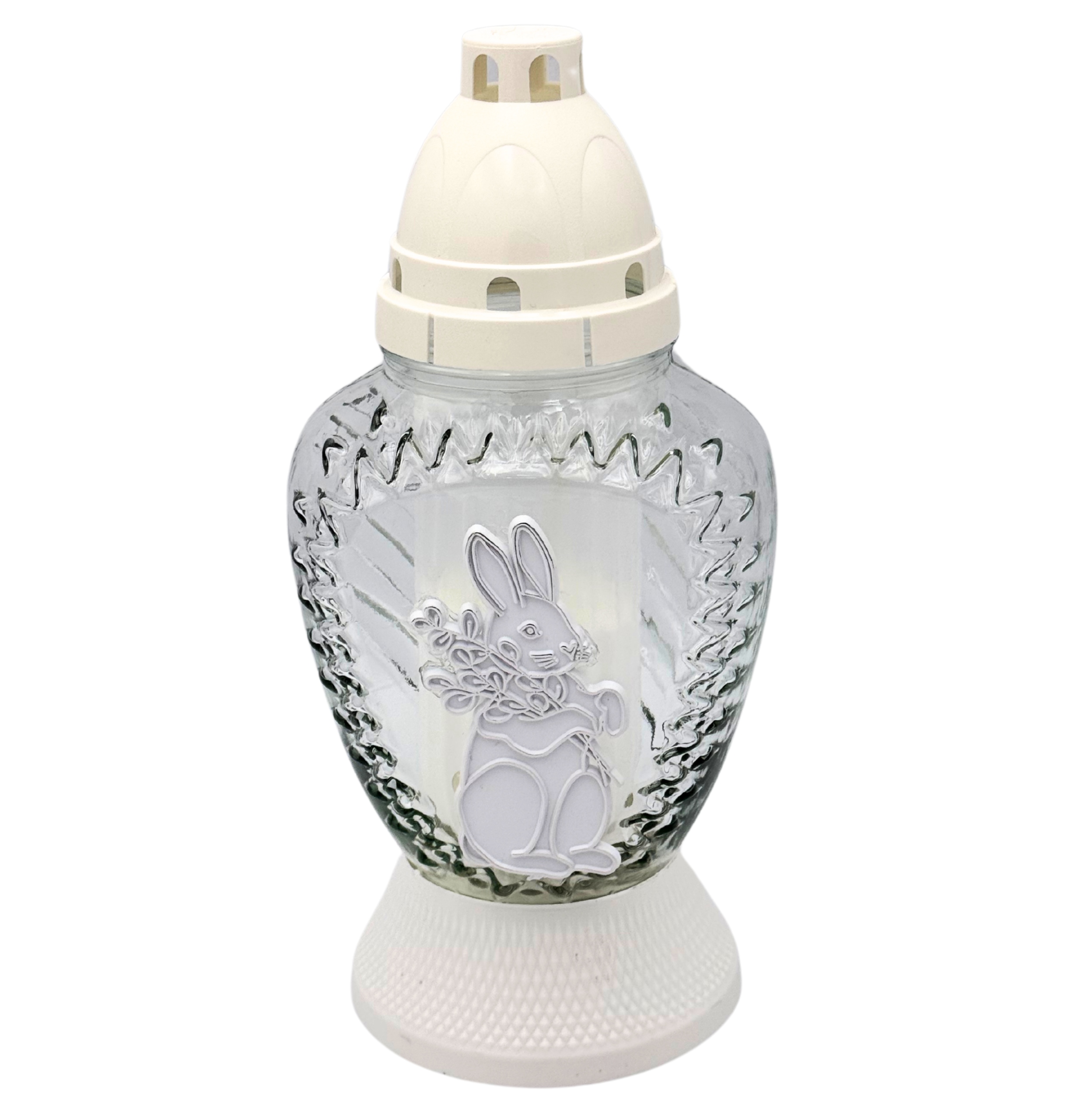 Stylowy znicz wielkanocny wykonany z wysokiej jakości szkła, ozdobiony delikatnym motywem zajączka trzymającego bazie. Subtelne zdobienia oraz jasna, elegancka kolorystyka sprawiają, że znicz pięknie prezentuje się na grobie, wprowadzając świąteczny, pełen spokoju klimat.