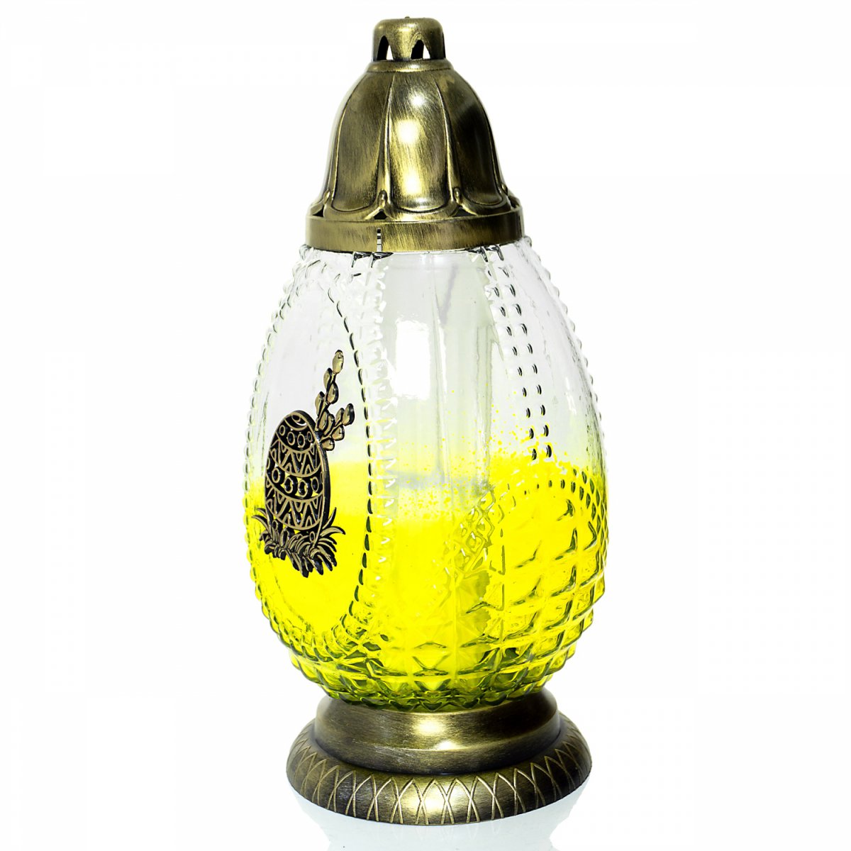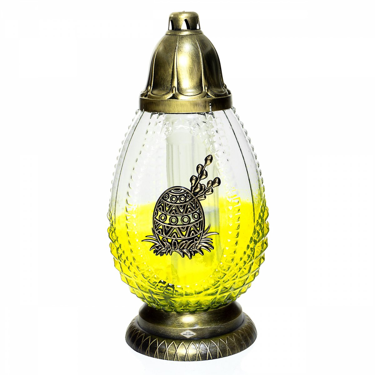 Elegancki znicz wielkanocny w kształcie dużej pisanki w złotym kolorze. Wykonany z dekoracyjnego szkła z delikatnym tłoczeniem, które pięknie rozprasza światło płomienia. Zdobiony aplikacją pisanki z wiosenną gałązką – symbolem nadziei i odrodzenia.